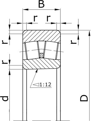 - Подшипники роликовые радиальные сферические двухрядные с бортиками на внутреннем кольце с коническим отверстием внутреннего кольца, конусностью 1:12