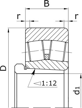 - Подшипники роликовые радиальные сферические двухрядные с бортиками на внутреннем кольце с коническим отверстием внутреннего кольца, конусностью 1:12